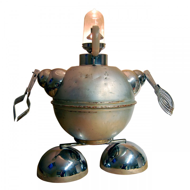 Each sculpture is composed of various recycled metal objects, such as kitchen utensils or other household or commercial objects.