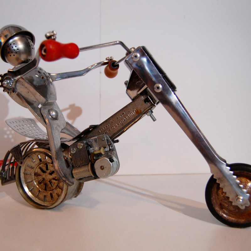 Each sculpture is composed of various recycled metal objects, such as kitchen utensils or other household or commercial objects.