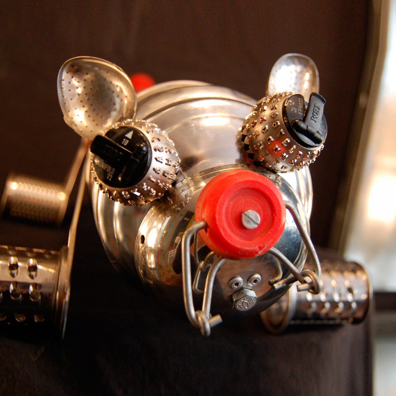 Each sculpture is composed of various recycled metal objects, such as kitchen utensils or other household or commercial objects.