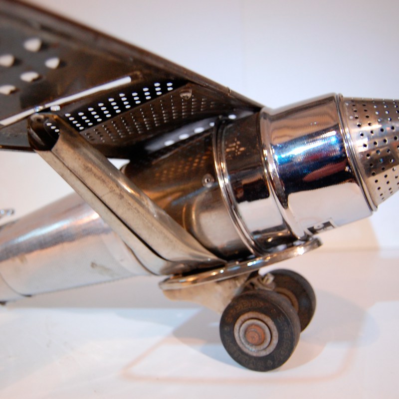 Each sculpture is composed of various recycled metal objects, such as kitchen utensils or other household or commercial objects.