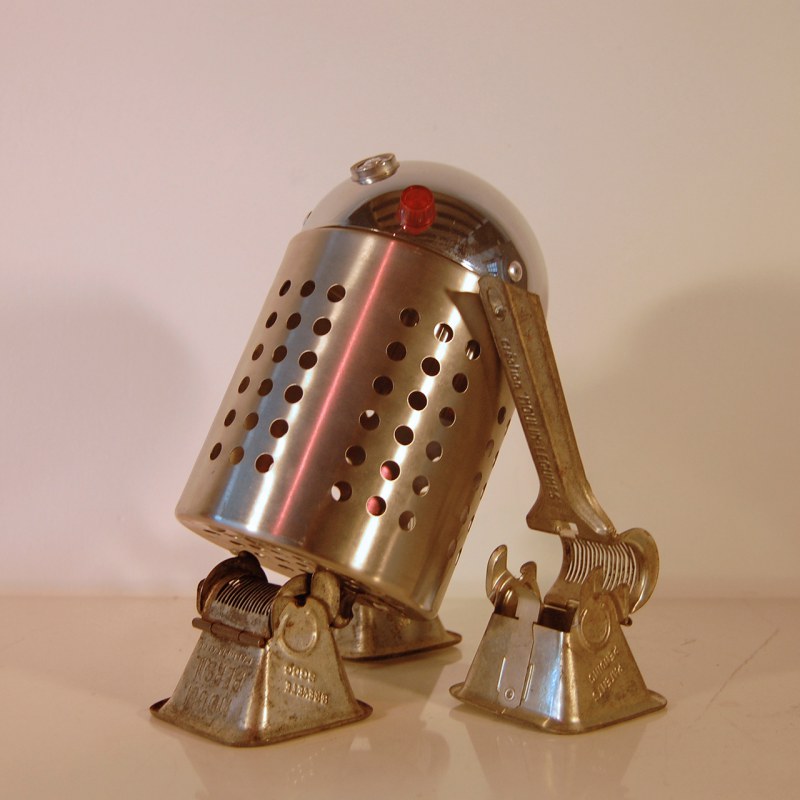 Each sculpture is composed of various recycled metal objects, such as kitchen utensils or other household or commercial objects.