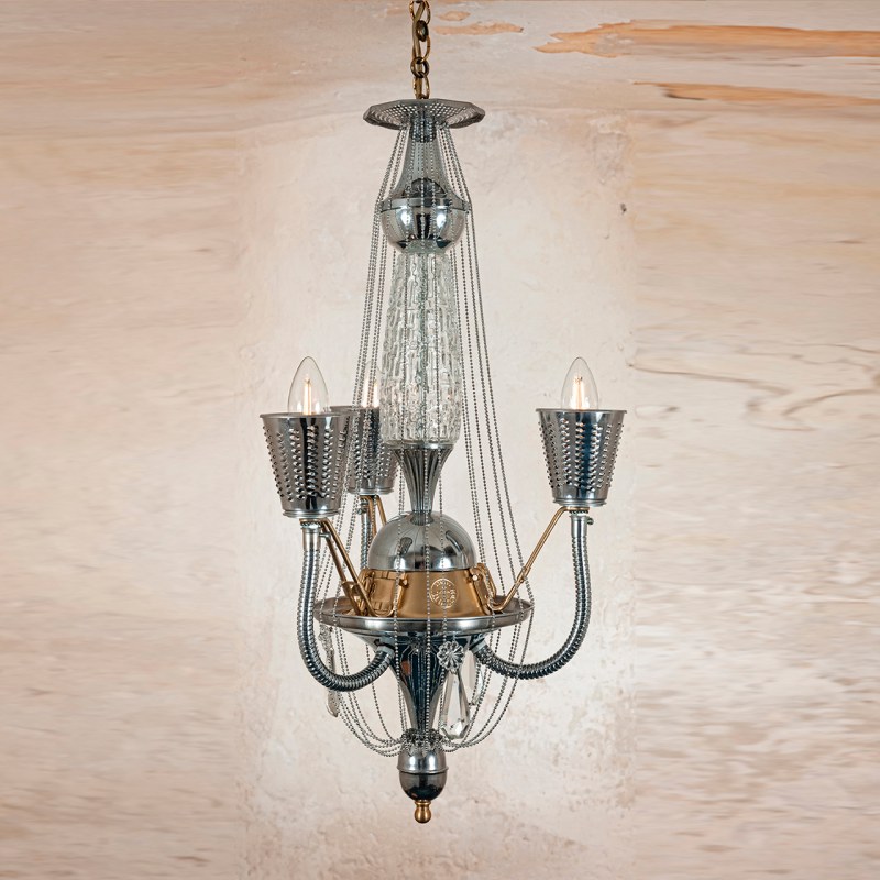 Mélange de style… Composé d’ustensiles de cuisine, flexible de douche, pampilles et plein d’autres objets qu’il vous reste à deviner.)