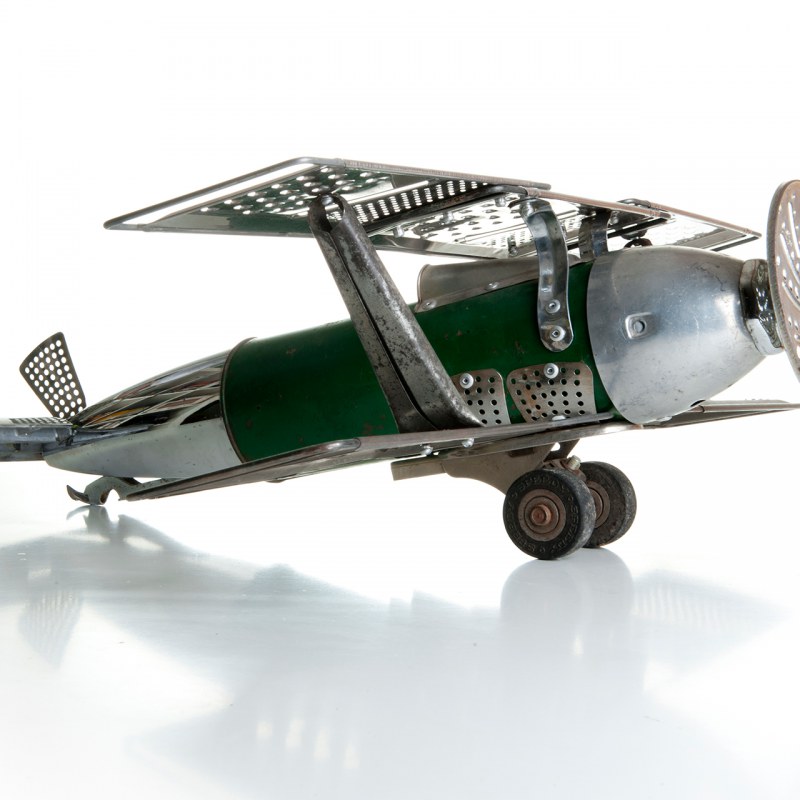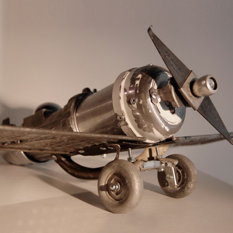 Une base d’assemblage de différents objets métalliques (ustensiles de cuisine) pour la création du fuselage et de rappes pour les ailes. De vieux patins à roulettes sont fréquemment utilisés pour le train d’atterrissage.