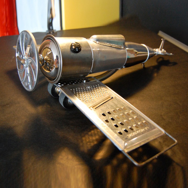 Une base d’assemblage de différents objets métalliques (ustensiles de cuisine) pour la création du fuselage et de rappes pour les ailes. De vieux patins à roulettes sont fréquemment utilisés pour le train d’atterrissage.